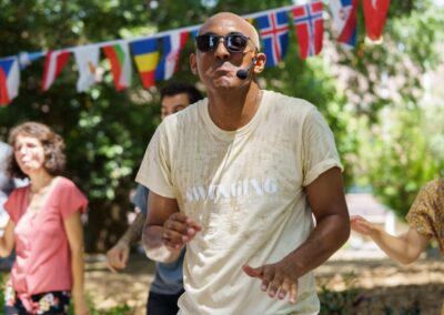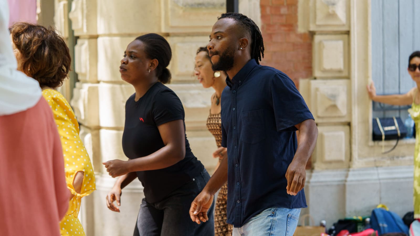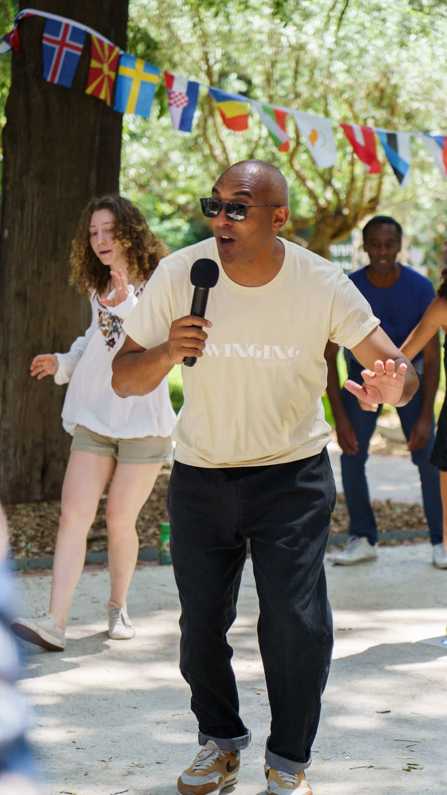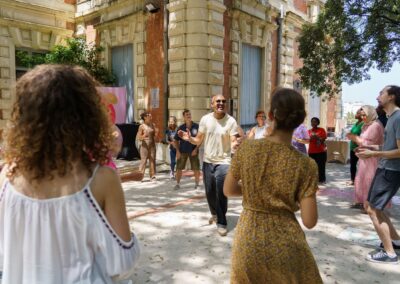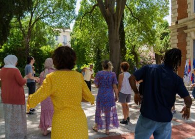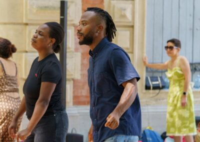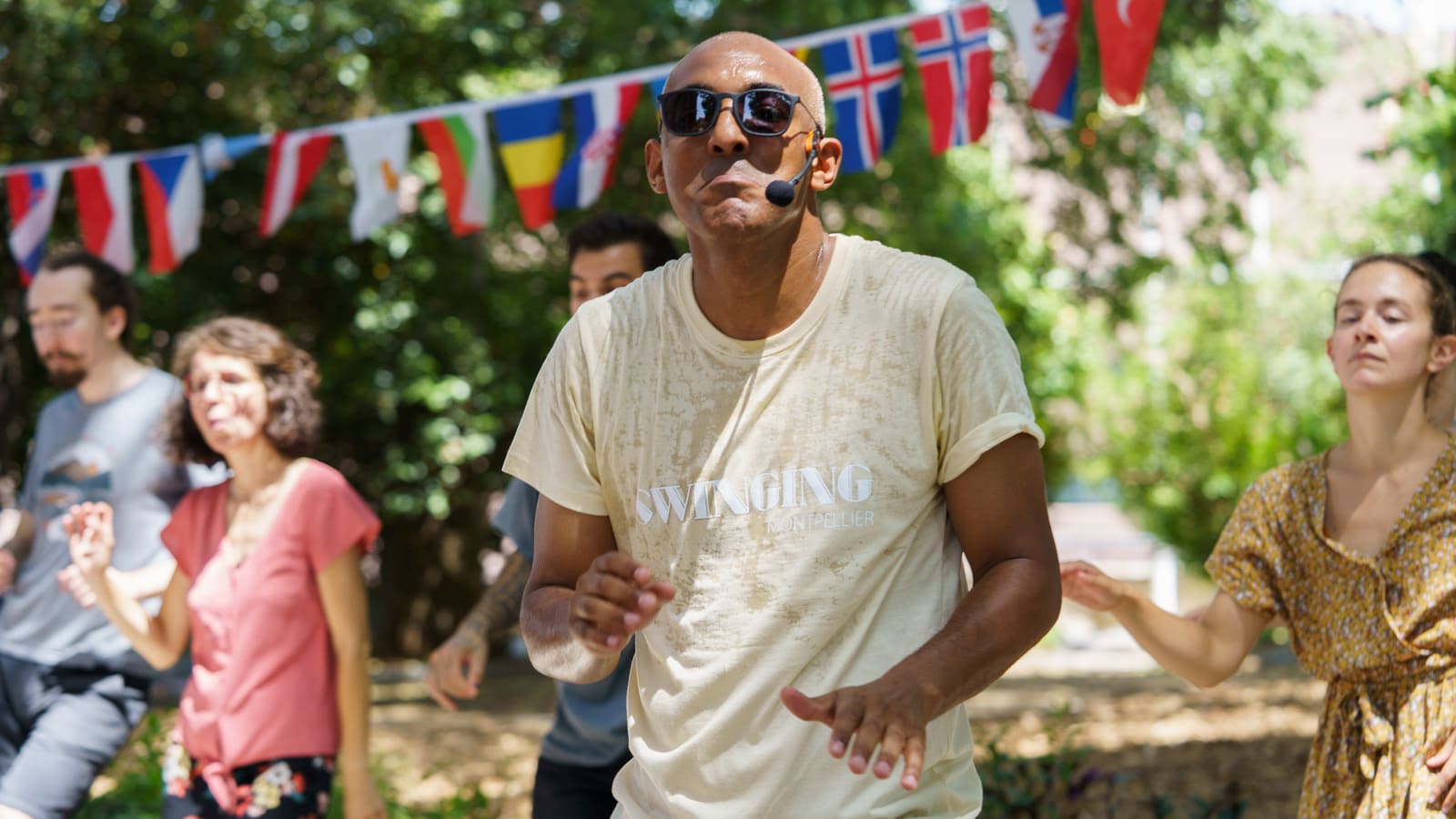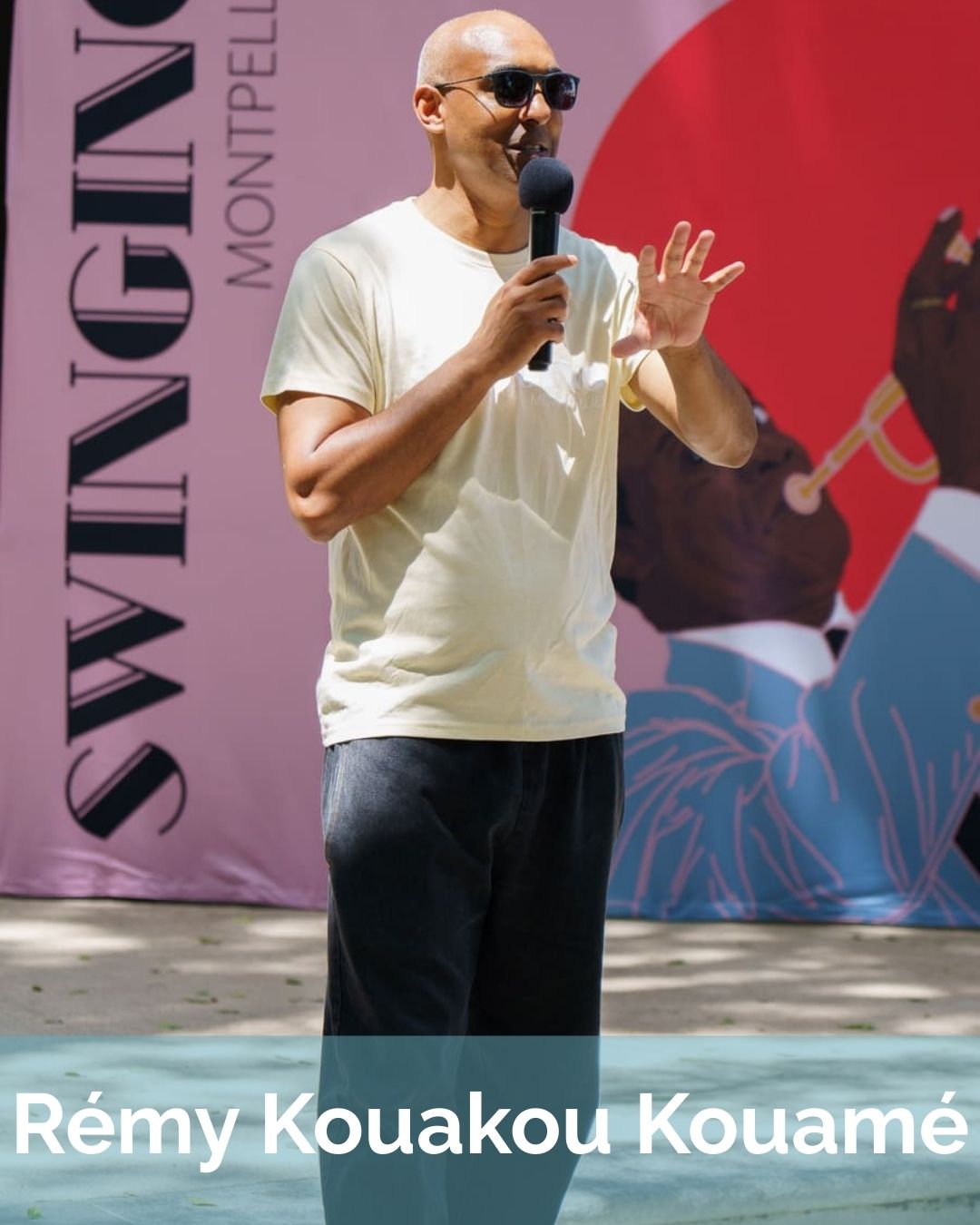 Rémy Kouakou Kouamé, directeur artistique du festival Swinging Montpellier, a animé une Jam pédagogique ouverte à tous. Une jam pédagogique est un atelier de danse en musique, où une progression dans la gestuelle est proposée afin d’explorer le répertoire jazz. Ludique et intuitif, ce dispositif est très inclusif et apprécié des danseurs et non danseurs. Le travail du mouvement est associé à des exercices de musicalité (écoute musicale) et de polyrythmie. Enfin, la session s’est clôturée par un temps de parole et d’échanges et une pratique sociale (bal dans la rue).