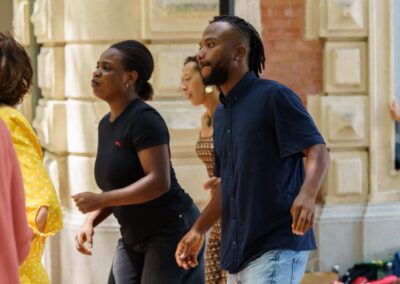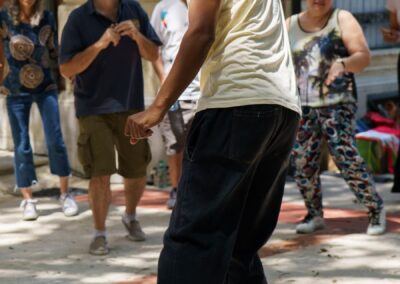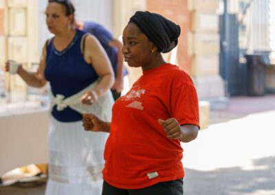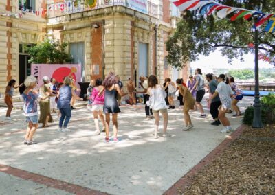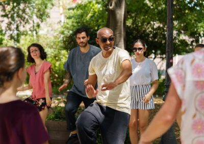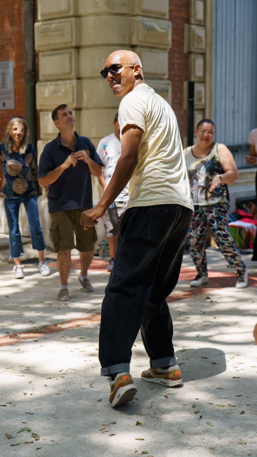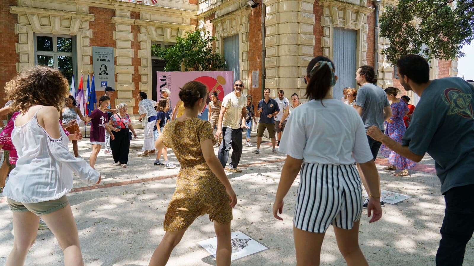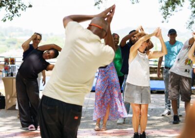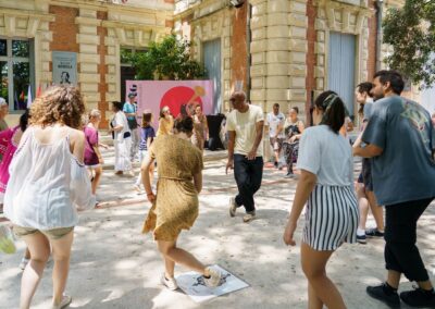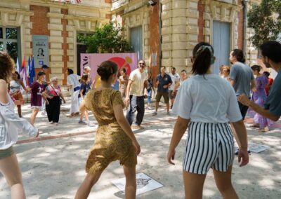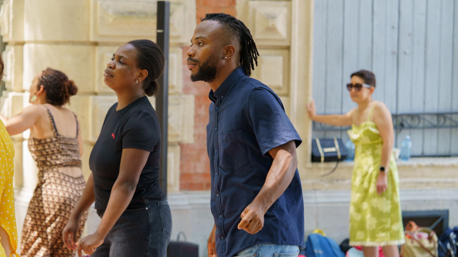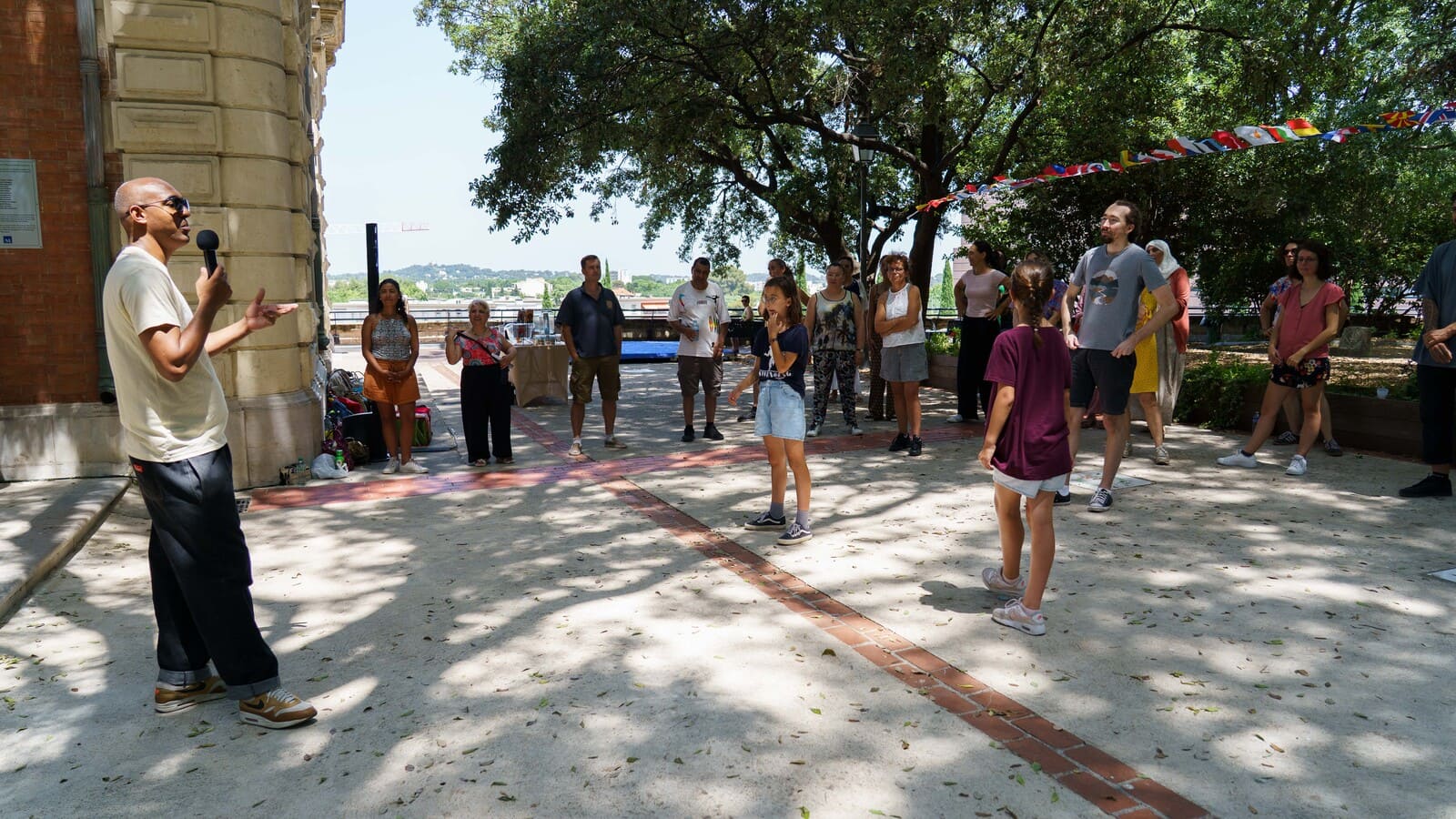 Rémy Kouakou Kouamé, directeur artistique du festival Swinging Montpellier, a animé une Jam pédagogique ouverte à tous. Une jam pédagogique est un atelier de danse en musique, où une progression dans la gestuelle est proposée afin d’explorer le répertoire jazz. Ludique et intuitif, ce dispositif est très inclusif et apprécié des danseurs et non danseurs. Le travail du mouvement est associé à des exercices de musicalité (écoute musicale) et de polyrythmie. Enfin, la session s’est clôturée par un temps de parole et d’échanges et une pratique sociale (bal dans la rue).